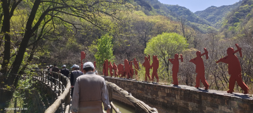 参观完分水苑后,全体人员来到红旗渠咽喉工程——青年洞,走在紧贴着山崖凌空而建的栈道上,步行的困难让大家真切的体会到当年施工的难度,红旗渠所展现的辉煌和气势让所有人震撼,《红旗渠铁姑娘》、《凌空除险》的表演,给全体人员留下了深刻的印象。林县人民不屈不挠的红旗渠精神,更是洗涤了大家的心灵。